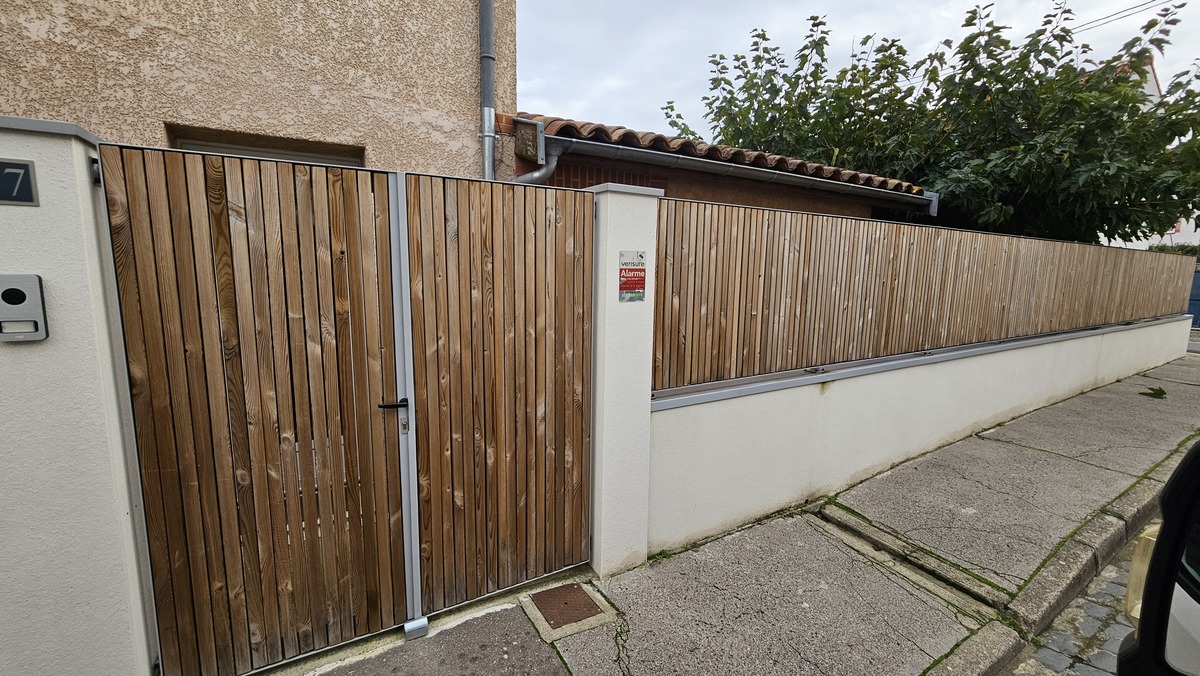 Dans le cadre de la rénovation d'une construction ancienne située à Toulouse, une clôture en bois de 22 mètres linéaires a été installée, accompagnée de la pose d’une couvertine sur muret. L’ensemble intègre des éléments en acier thermolaqué gris aluminium (RAL standard). Le design du projet a été réalisé par le cabinet d’architecture THEM, spécialisé en architecture et design.