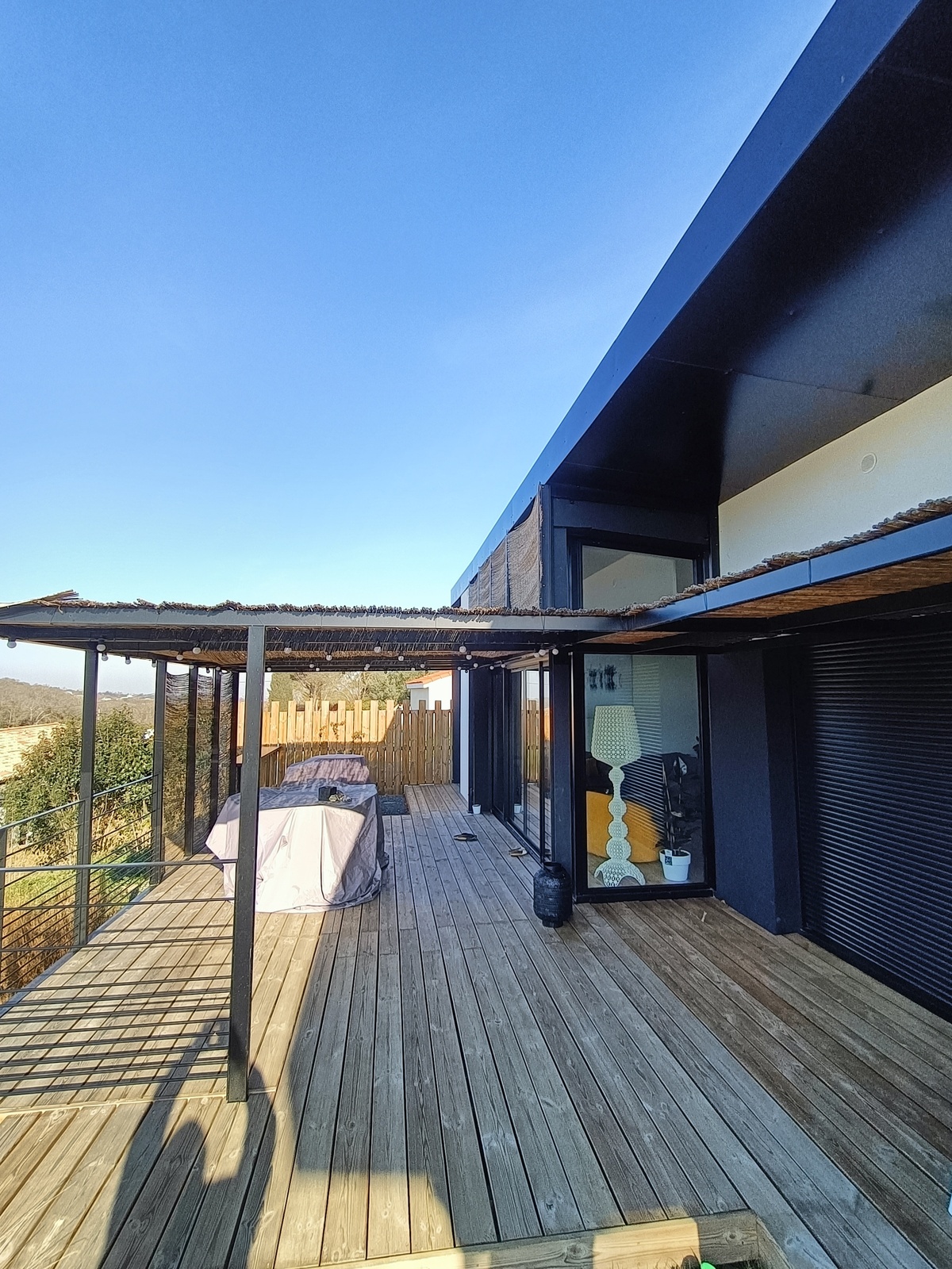 À Vigoulet-Auzil, dans le cadre d’une construction neuve, réalisation d’une pergola en acier thermolaqué RAL 9005. La structure intègre des filins inox, permettant l’installation d’une couverture en canisse, posée par le client.