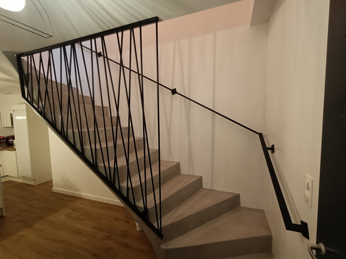 À Bessières, dans le cadre d’une construction neuve, réalisation d’un garde-corps type "Mikado" en acier thermolaqué RAL 9005 S. L’ossature a été fabriquée et assemblée directement sur site, pour un ajustement parfait à l’existant.