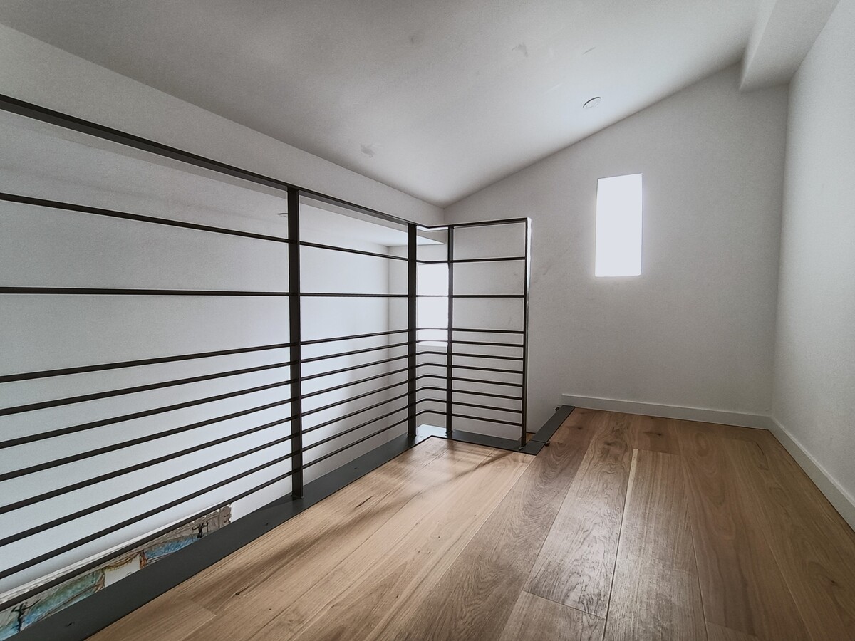 À Toulouse, dans une construction ancienne, réalisation d’un garde-corps type barreaudage horizontal accompagné d’un habillage de trémie. L’ensemble est en acier thermolaqué finition RAL 7039 mat.