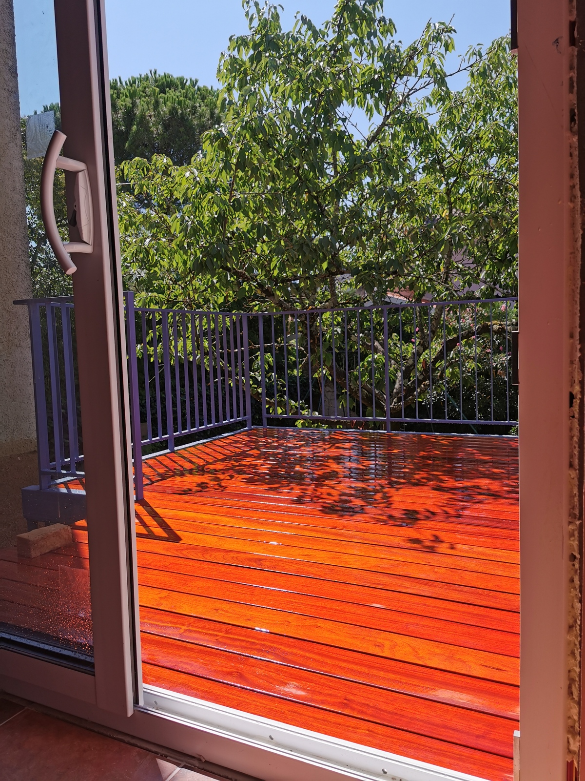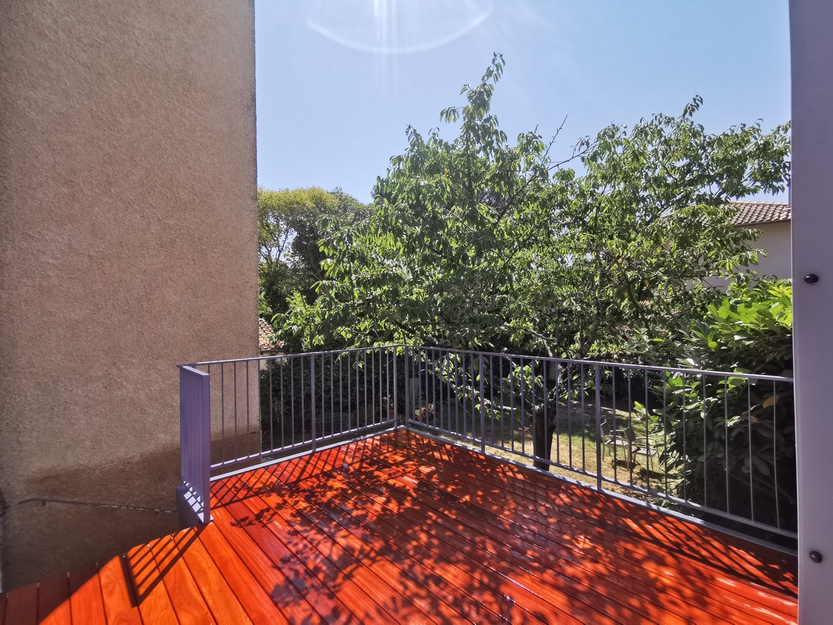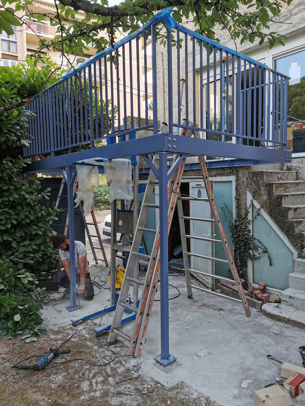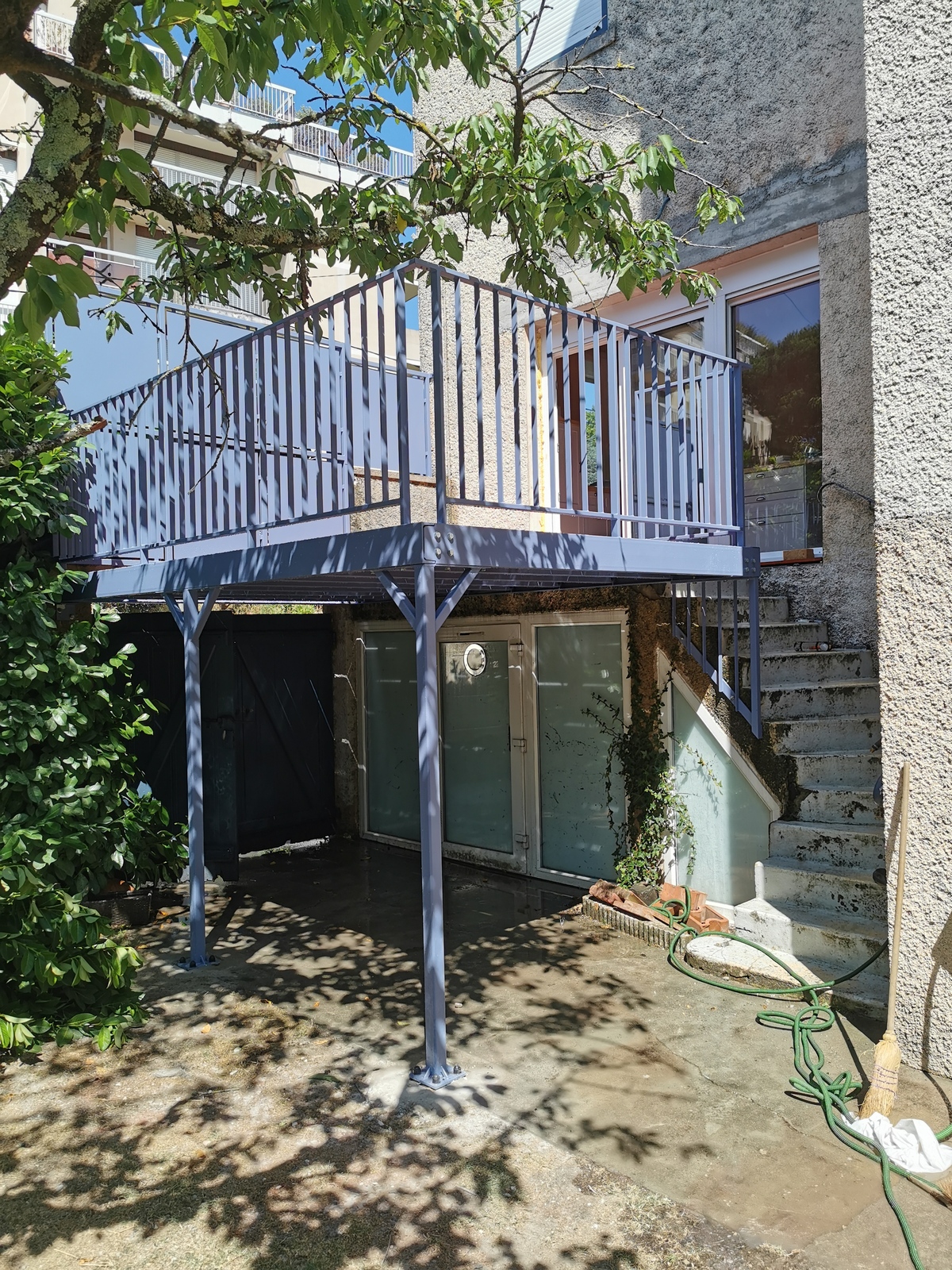À Toulouse, agrandissement d’une terrasse existante sur une surface de 2,5 x 4 mètres, comprenant la dépose de l’ancien aménagement. Réalisation d'une nouvelle structure en acier thermolaqué intégrant garde-corps et brise-vue. Le plancher est en bois exotique Padouk, choisi pour sa durabilité et son esthétique.
