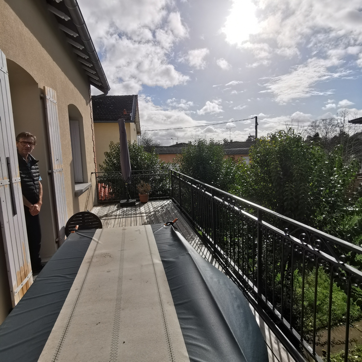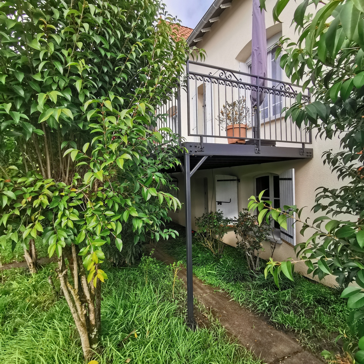 À Gaillac, sur une construction ancienne, réalisation d’une terrasse de 8 x 3 mètres comprenant un garde-corps en ferronnerie et un plancher en bois exotique. La structure est en acier thermolaqué avec métallisation, finition RAL 2100 S, pour une protection renforcée et une esthétique soignée.